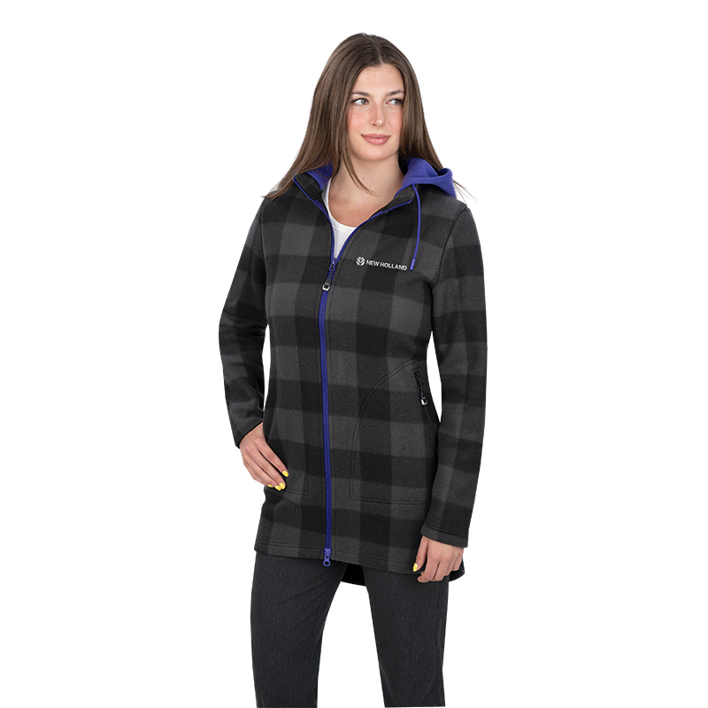 *100% Polyester bonded fleece *Two exterior zippered pockets *Fixed fleece hood with drawcords *2-way YKK® center front zipper *Flattering fit